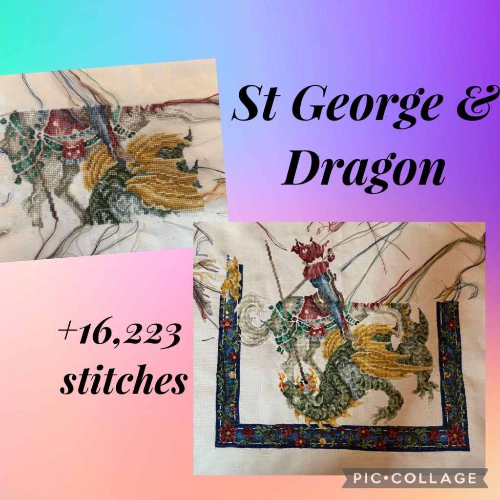 6. St. George and Dragon by Vermillion, another 15k progress goal. With 18 days, I managed 16, 223 stitches. I finished the bottom half, including border, backstitched a lot of the border, then started on the upper half.