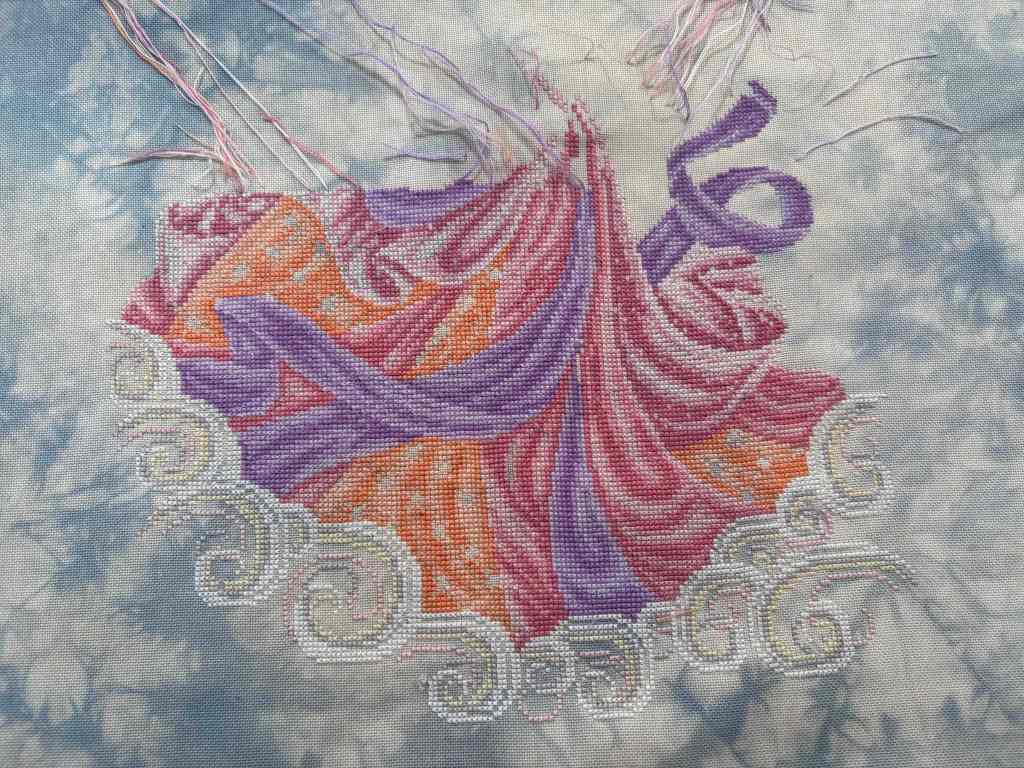 Fairy of the Clouds had 3 days attention and 3,000 stitches done. I love working on this piece, the colors are so pretty and the stitching is easy with long bands of color. I worked up to the midline of the chart (and beyond), so next month, I will go back to the bottom and start backstitching.