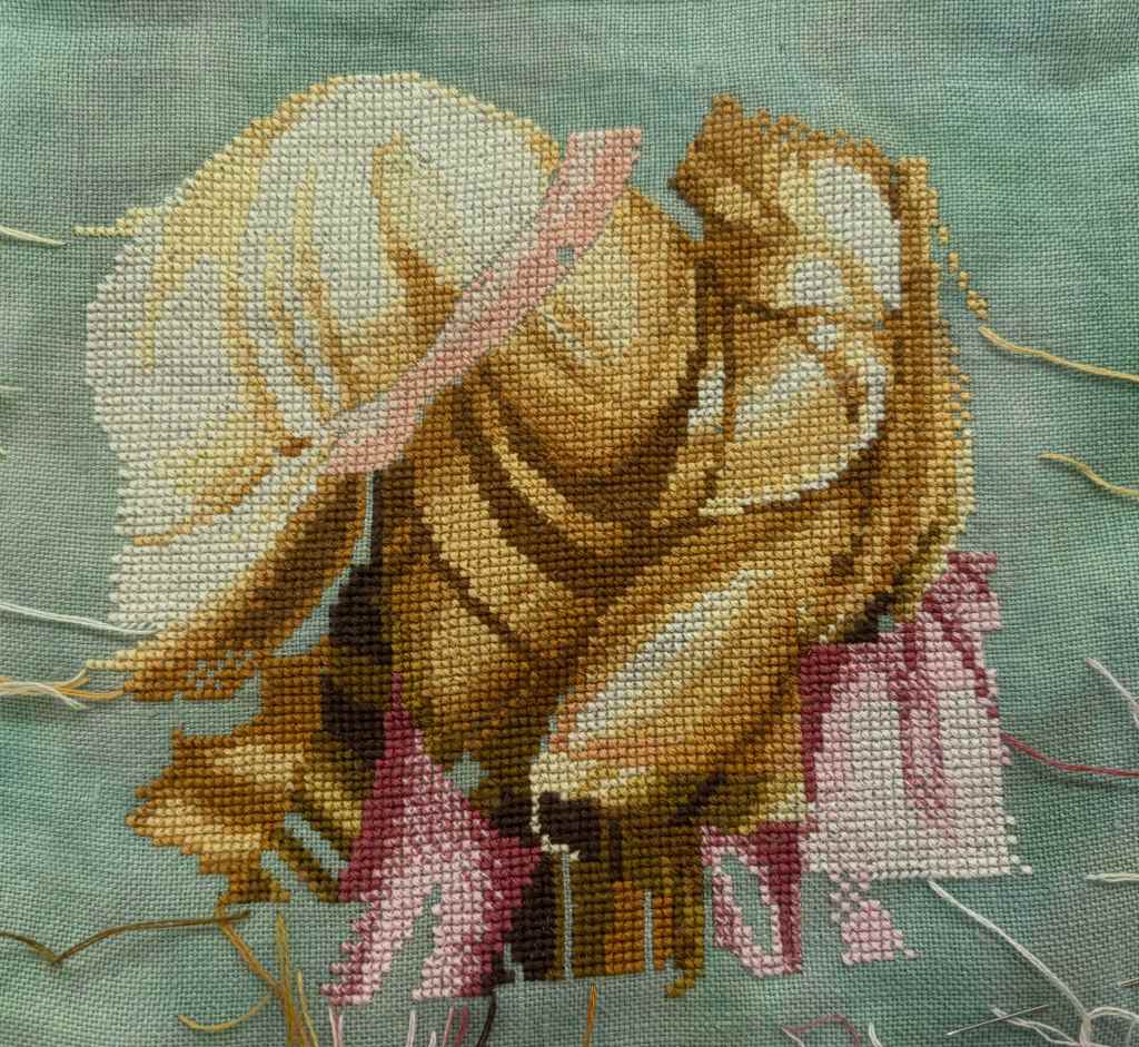 Fairy Idyll had 3.5 days love and 3,000 stitches added. I’m really close to moving onto another page…. I made a working copy of 9 pages for this chart. It’s fun, working on the pink bedding after miles of yellow for the dress.