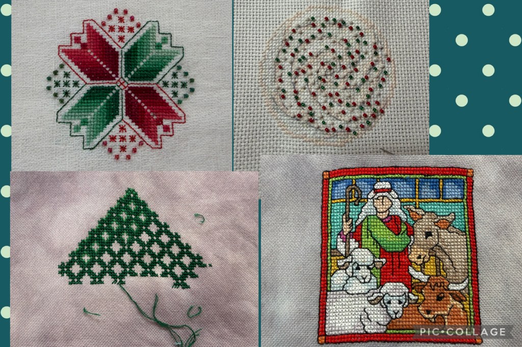 As for my little ornies, I achieved 3 finishes, (clockwise from top left): Holiday Flair by Linda Jenkins (1.5 days, 495 st), Christmas Cake by Rhona Norrie (0.5 day, 244 st), and O Holy Night Shepherd by Linda Gillum (0.5 day, 107 st). I also made a new start, Regal Diamond by Kim Beamish from JCS Christmas 2023.