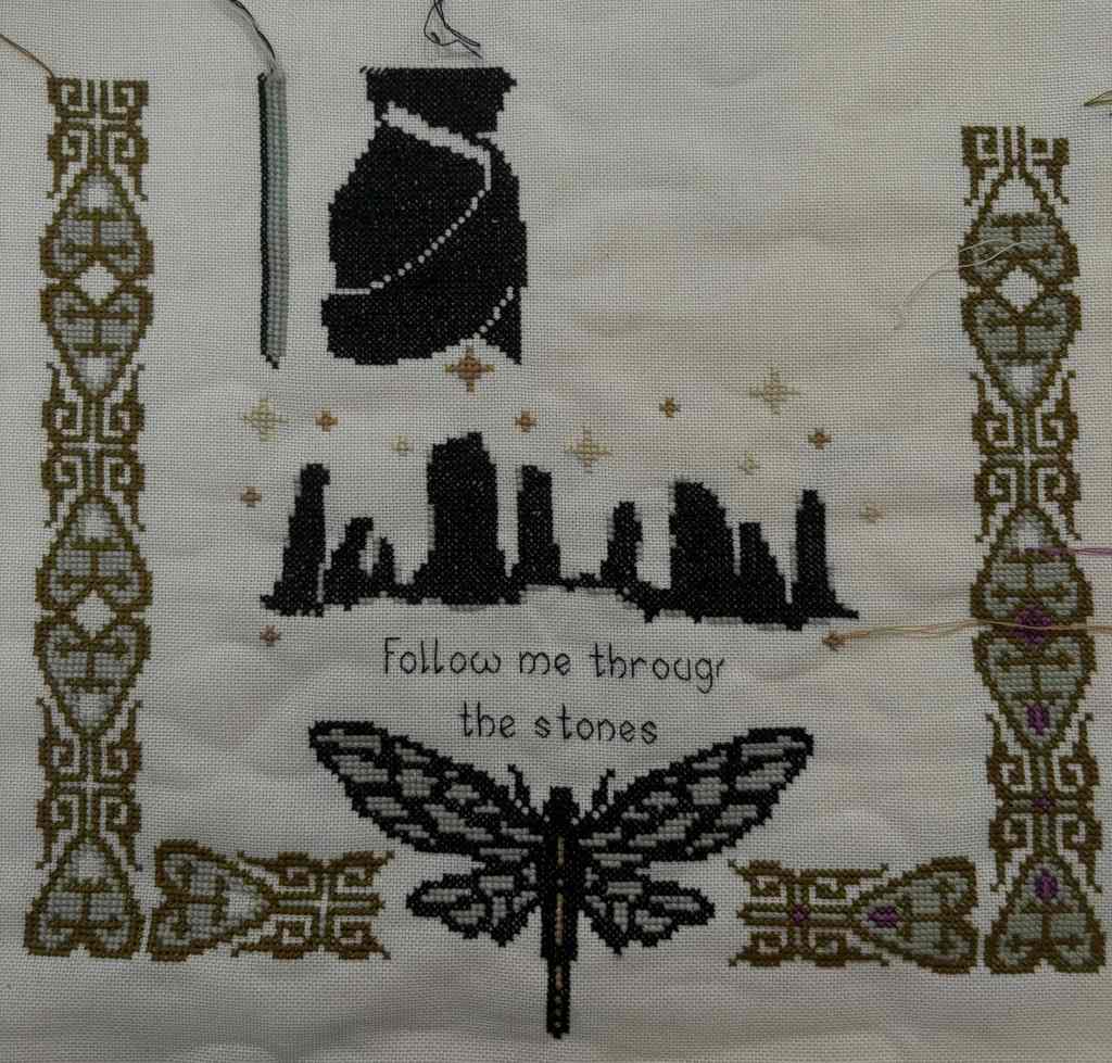 Outlander Sampler had 2 days and 2,000 stitches added. I worked on Jamie’s bust, up the page break, and he’s quite handsome even in silhouette! I also did more on the standing stones, the stars, and the right border.