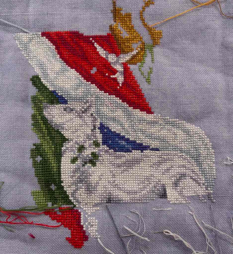 Santa’s Gifts had 3.5 days and 3,000 stitched. I just adore this chart, the animals are so fun. I worked on the robe, fur trim, blue lining, green gown, red trim, the brown sack, green ribbon and quite a lot on the wolf and the leaves around his neck.