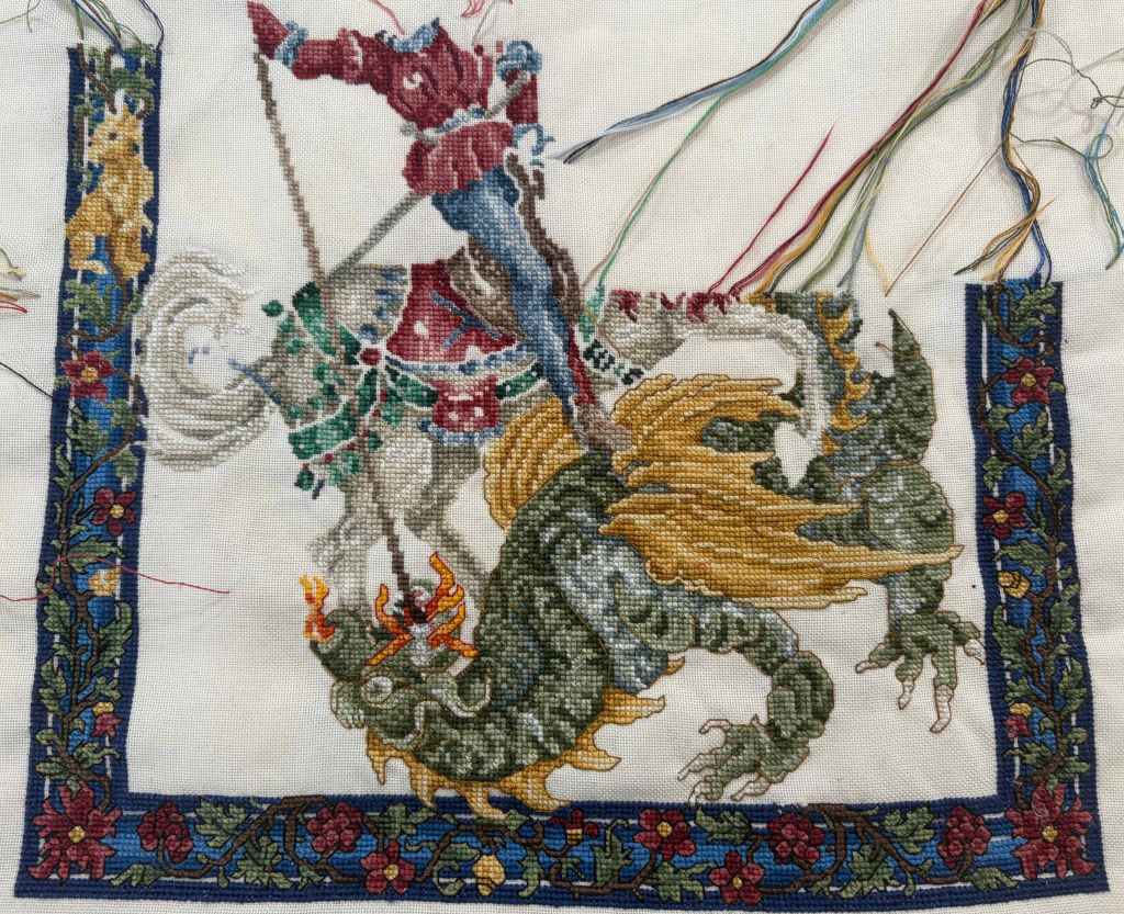 St. George and Dragon had 2 days and 1,700 stitches done, mostly on George’s shirt, but also the left border. Then went back to the bottom and started backstitching the dragon and filling in some ninja stitches. The dragon (on the bottom half) is mostly backstitched at this point, though I didn’t do the eye or mouth, flames are in progress.