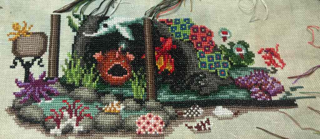 Deadly Aquarium received 3 days and 2,300 stitches. I finished the first page and continued working right towards center with the cave, the squid, coral, water at the bottom, the black and brown base, and some sea snails. It was a pretty good start on the second (middle) page, I should be able to finish the page in April (it’s much less coverage), and start the right page with the crocodile.