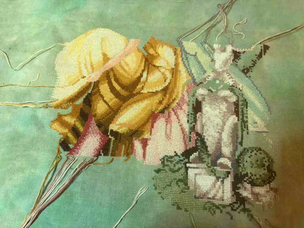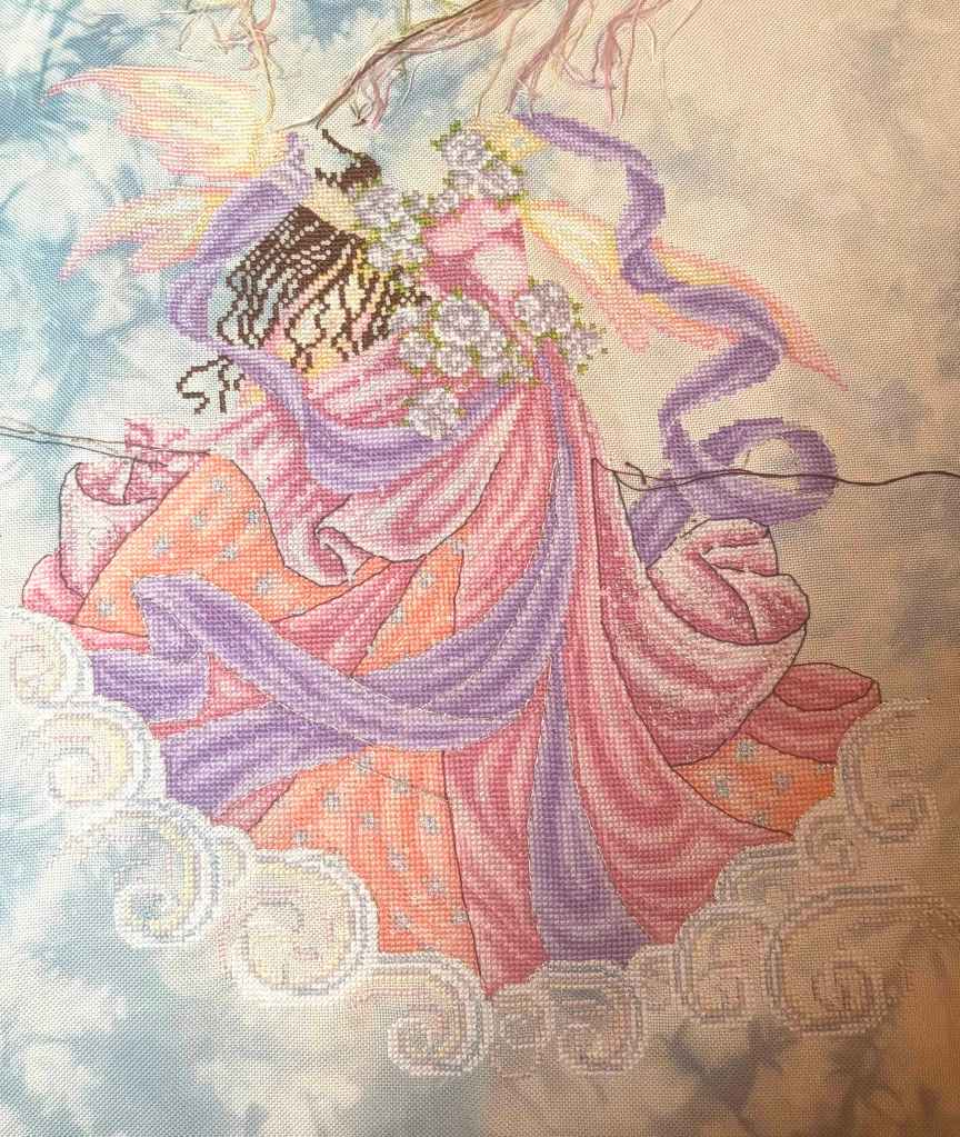First, primary WIP Fairy Clouds had 5 days love and 3,413 stitches done. I continued on the upper part of the chart, stitching her bodice and wings, the scarf, her hair and a bit of the arms. With the 7k I did between March and February, she is good position for a spring finish.