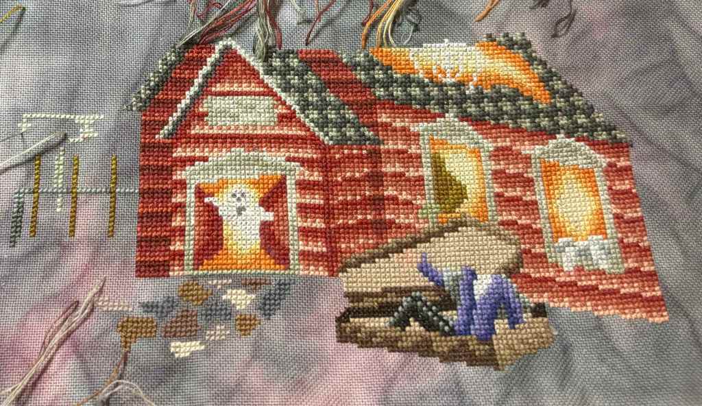 Now for secondary pieces, Ghool School received 2 days love and 2,500 stitches added. I continued on the main school house, the roof, started the stone path, and the broom rack and sign to the left. The left side isn’t as much coverage, so I may be able to finish the left page in April, we’ll see.