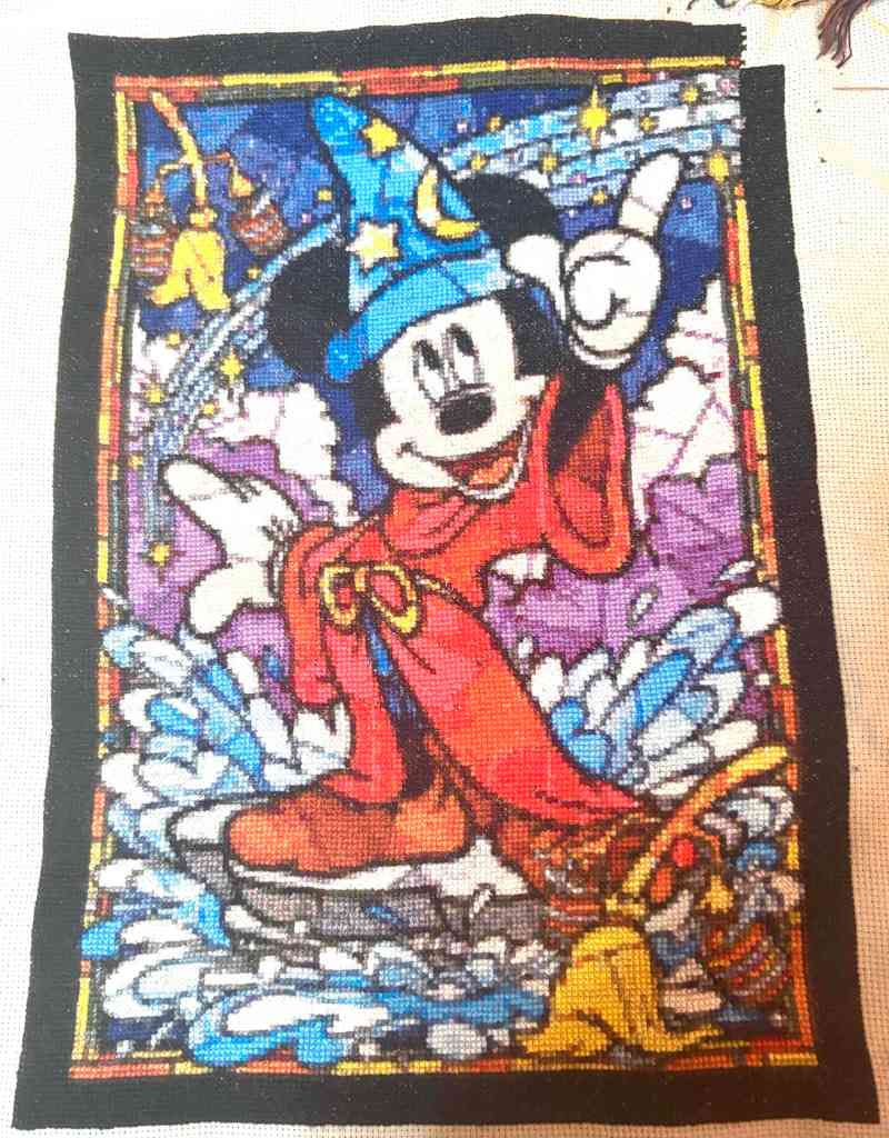 Tertiary pieces, starting with Mickey Stained Glass. My oldest WIP had 2 days, and 1600 stitches added. It’s very close to finished now, and definitely on deck for an April finish. Just a few colors (black and black-brown) to finish that upper right corner border. I quite enjoyed working this full coverage on the diagonal. Well, I did each page on the diagonal, then worked the pages on the diagonal.