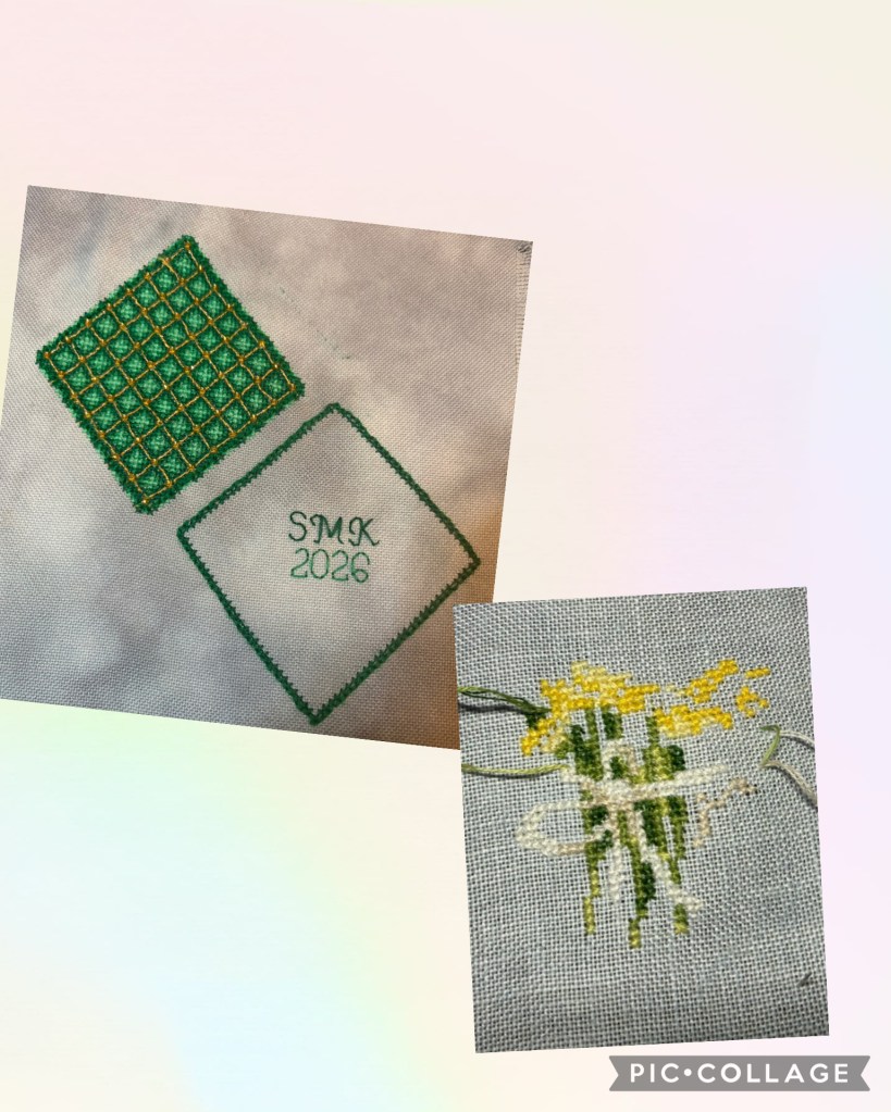 Last but not least, my smalls…. Regal Diamond had 1.25 days, 1033 stitches, and it’s finished! My 4th ornament of the year, of 12. I wanted to participate in the Semisane Spring Start to finish challenge, so I decided to start Egg with Daffodils, companion chart to the Egg with Tulips I stitched last year. Daffodils had 3.5 days and 387 stitches done, very minimal effort some of the days that I was on vacation.