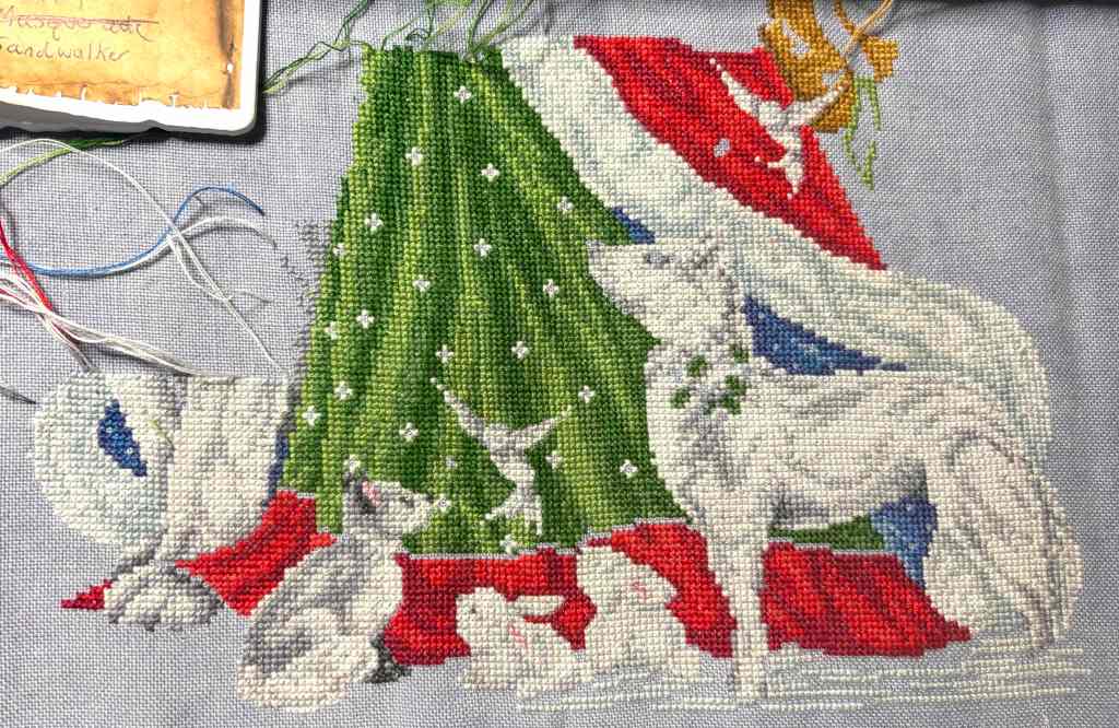 Santa’s Gifts received 4 days attention and 3,400 stitches added. I was working towards the left edge along the bottom, filling in the bunnies, stitching the fox, starting the bear, and a whole lot of green gown and a bit of the red coat with the blue lining and white fur trim