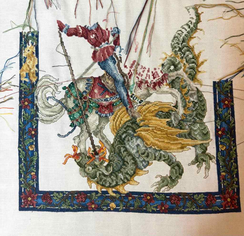 Question of the month: Which of your current WIPs do you consider your most difficult piece to stitch? St. George would have to be the one, with the 36 count fabric, frequent color changes, copious quarter stitches, and numerous blended colors. He’s certainly a work of art, though, so I will keep plugging away.